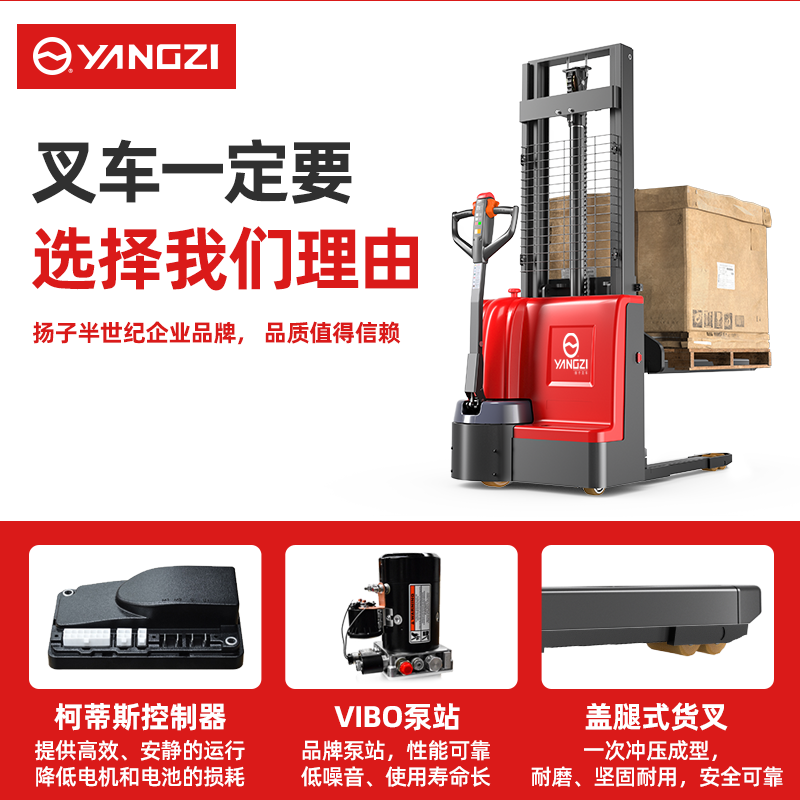 揚子堆高車PS:推高車喇叭設計,人體防撞緩沖設計,低速行駛按鈕設計,前進后退旋轉撥片,還擁有加厚型油缸,專用品牌電池,長久續航更耐用。